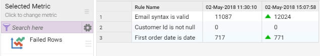To see other metrics (such as passed rows), click on Failed Rows and select the required one. To view results as a chart, click Show Chart.