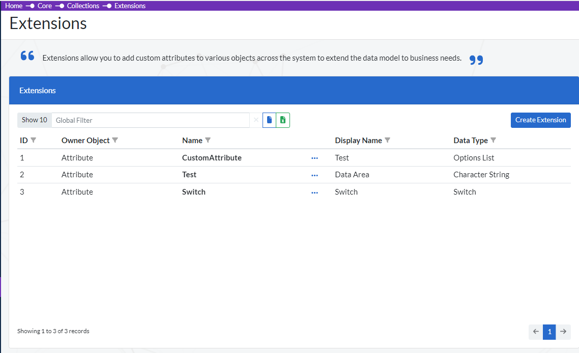 To navigate to the Extensions screen go to (Core > Collections > Extensions ) and you will be presented with a list of current extensions as shown below.