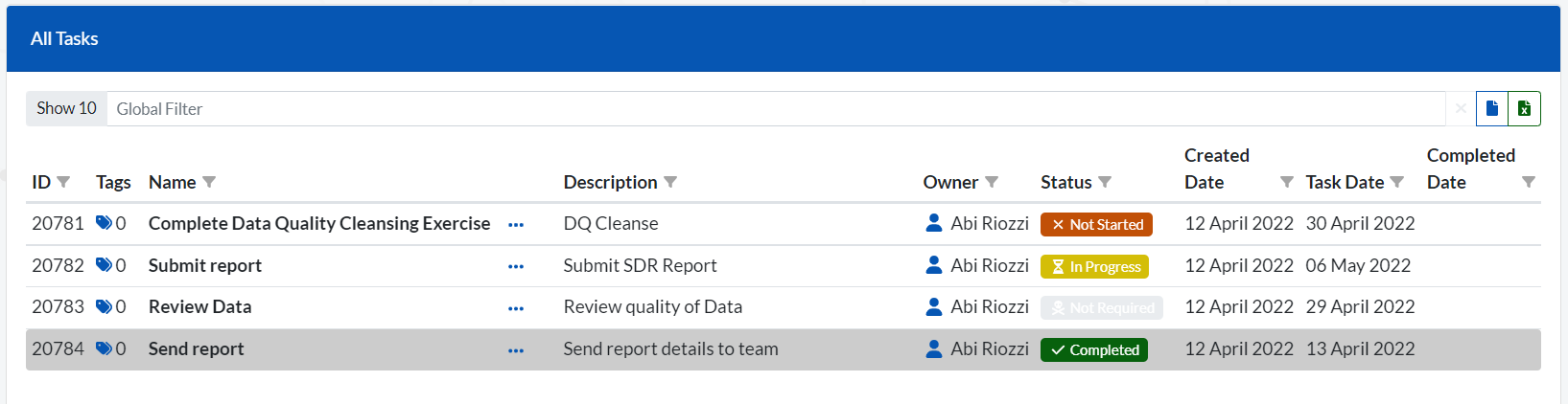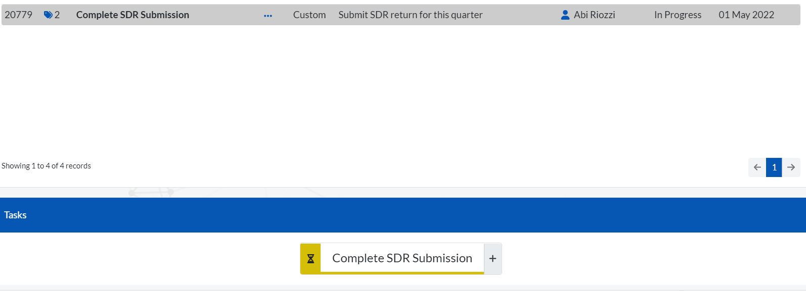 Scrolling further down the page will bring you to an itemised list of all tasks allocated to you, your team or your role, with the owner, status, the date the task was created, task date (the task’s due date) and the date the task was completed (if applicable):