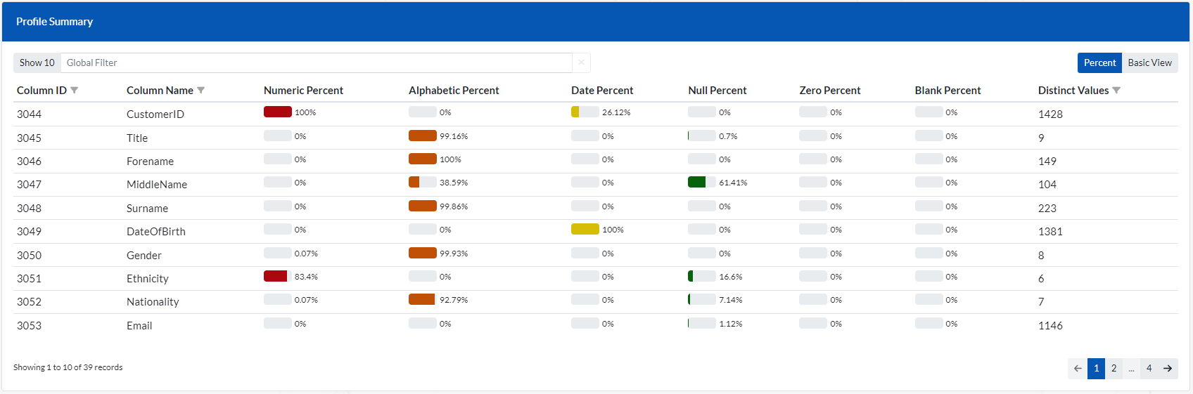 This is the section that displays the evaluation of each column after the profiling job has been set up and run.