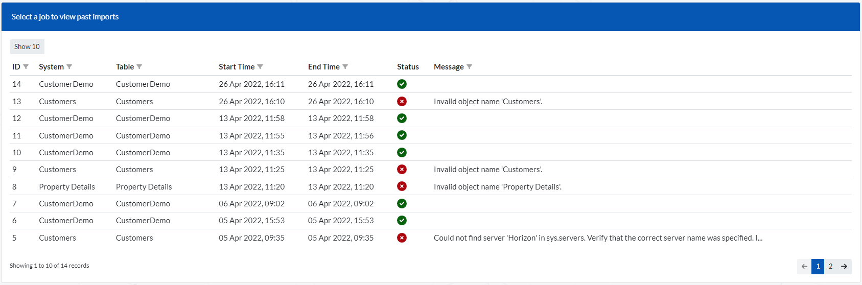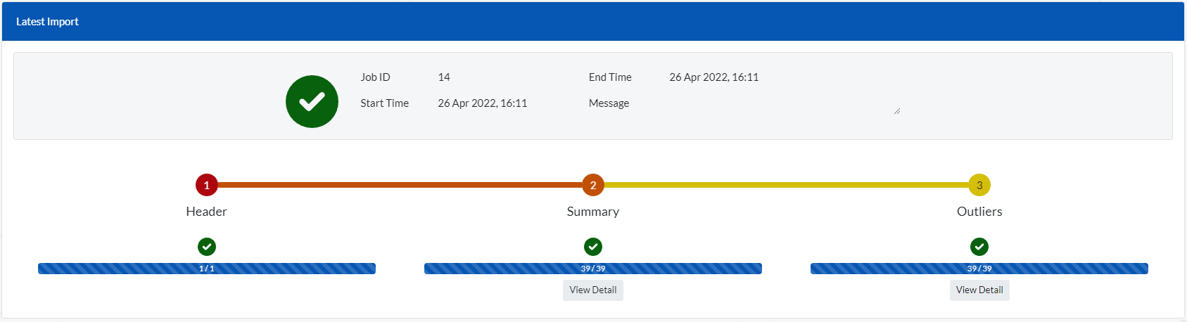 This window shows the status of the latest job or whichever job is currently selected. It indicates if the (Header, Summary, Outliers) stages of the job have run successfully. If there is an error in any of the stages a cross (‘x’) will be displayed instead of a tick. For the Summary and Outlier stages you can click on the ‘View Detail’ button below them to get more information on that stage.