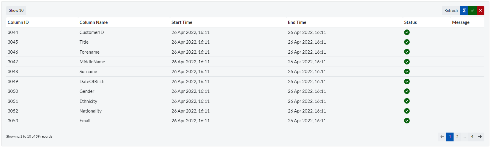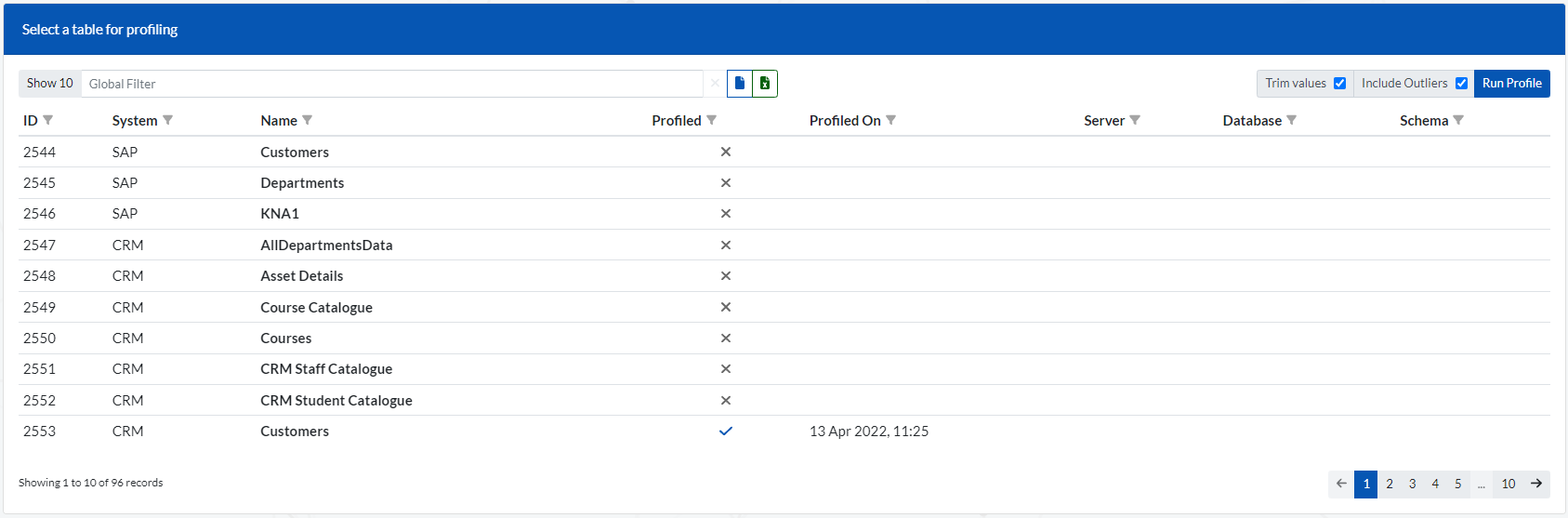 Contains List of all tables available to be profiled. If a table has already been profiled a tick will be displayed in the ‘Profiled’ column. These tables will be available for analysis in the ‘Profiling > Dashboard’ section.