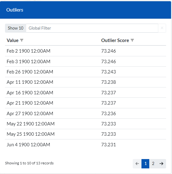 A window displaying the Outliers items found and their Outlier score. If no outliers are found in the selected column, this screen will be empty with the message ‘No data to display’