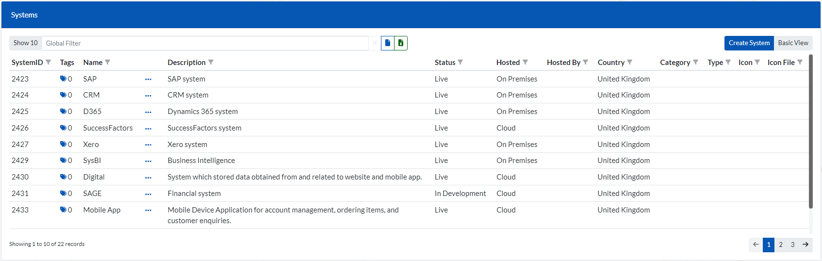 These are the systems that make up your architecture. They can be anything from systems, to spreadsheets, to user groups or 3rd parties. Defined systems can then be used within ‘Data Lineage’ and ‘Profiling’ sections.